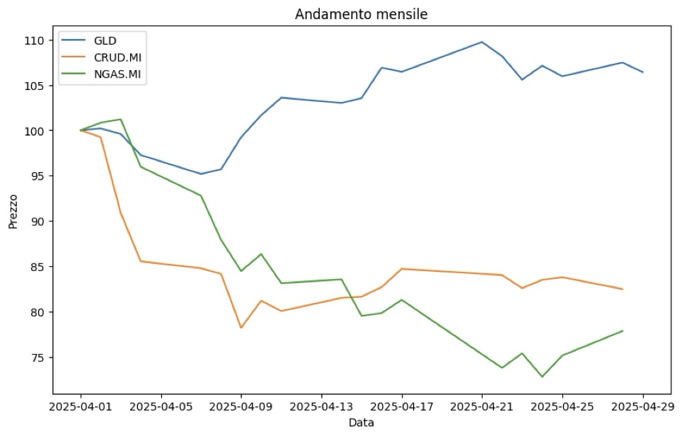Mese negativo per gas naturale e petrolio con perdite importantissime sui timori di recessione e su stoccaggi di gas pieni (sopra la media stagionale). L’oro ha toccato nuovi massimi complici il deprezzamento del dollaro e la guerra commerciale di Trump arrivando ai 3300$ l’oncia per poi decrescere verso fine mese.