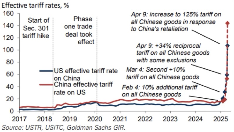 Come evidenziato dal grafico le tensioni commerciali hanno raggiunto ad inizio mese livelli che non si vedevano da decenni, con Trump che ha portato i dazi sulle importazioni cinesi al 145% e la Cina che ha riposto portando i dazi sugli import americani al 125%, innescando di fatto una guerra commerciale con dazi rivisti in continuazione da parte delle due più grandi potenze economiche del mondo.