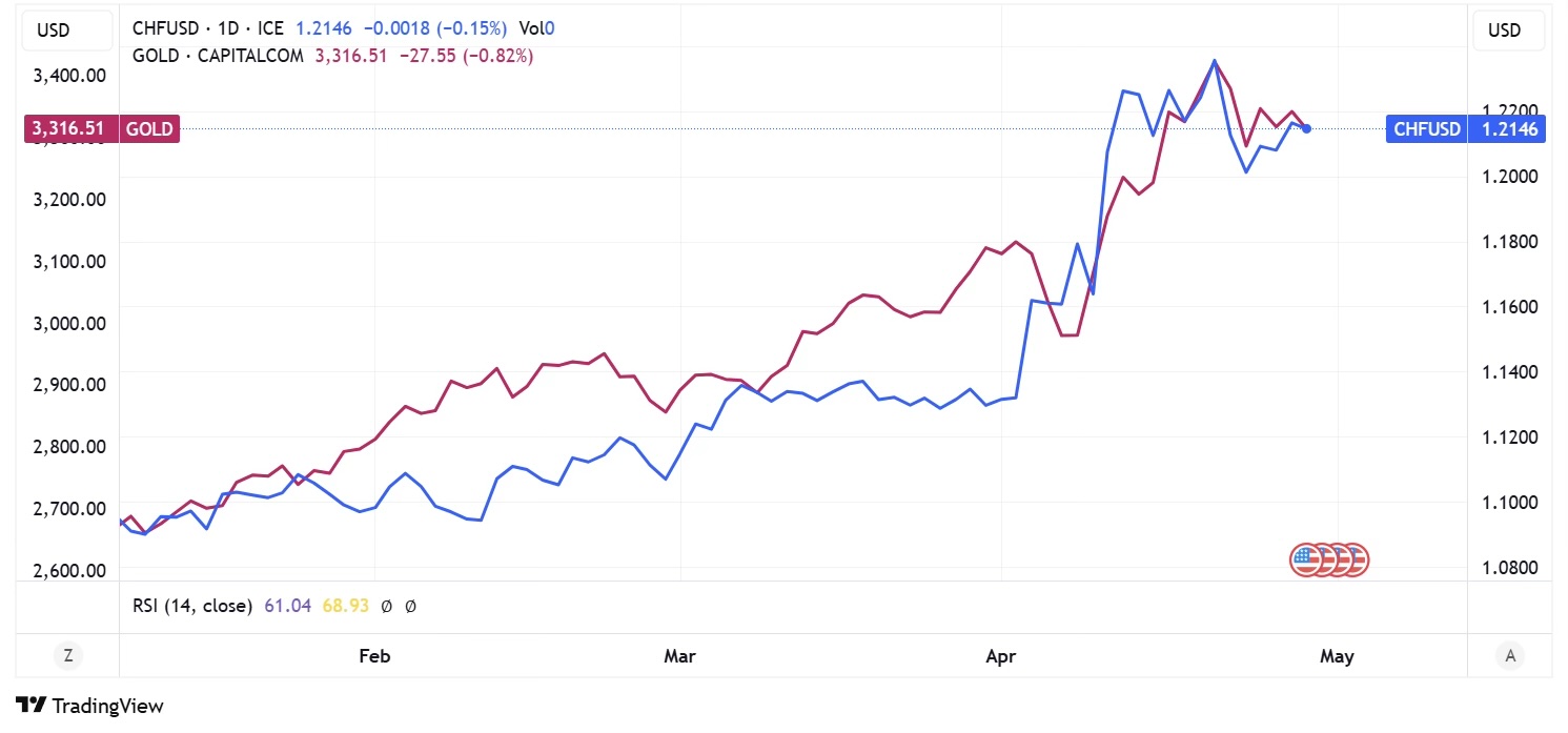 Grafico 2 – L’andamento da inizio anno del cambio CHF/USD e del prezzo dell’oro